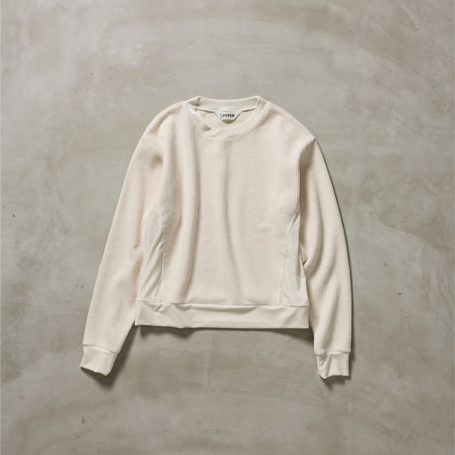[material] (表地) cotton : 60% polyester : 40% (裏地) : polyester : 90% polyurethane : 10% [size] 肩幅:50cm 着丈:58cm 袖丈:60cm バスト:110cm リブのような畝(うね)を持つソフトなタッチのニットコールと、挑発的かつエレガントな光沢を持つベロアを掛け合わせたトップスです。 脇部分の縫製には、水着や下着にも使われる特殊ミシン「フラットシーマ」を採用。素材同士の厚みを抑えて平らに仕上げることで、素肌のあたり方が優しい着心地を実現しました。