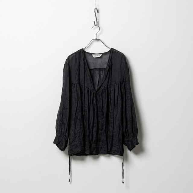 [material] (生地 1) cotton : 100% (生地 2) cotton : 100% (生地 3) linen : 100% [size] 着丈:58cm 裄丈:79cm バスト:180cm フレンチリネンをベースに、インドのコットンカットレースと日本のカットレースを組み合わせた、多国籍な素材感が融合するヴィンテージライクなブラウスです。 シェルボタンの横には2本のプリーツを配し、さらに共布のテープを叩きつけることで、平面的になりがちなレースアイテムに奥行きと立体感を与えています。異なる文化の素材が織りなす、独特のコントラストをお楽しみください