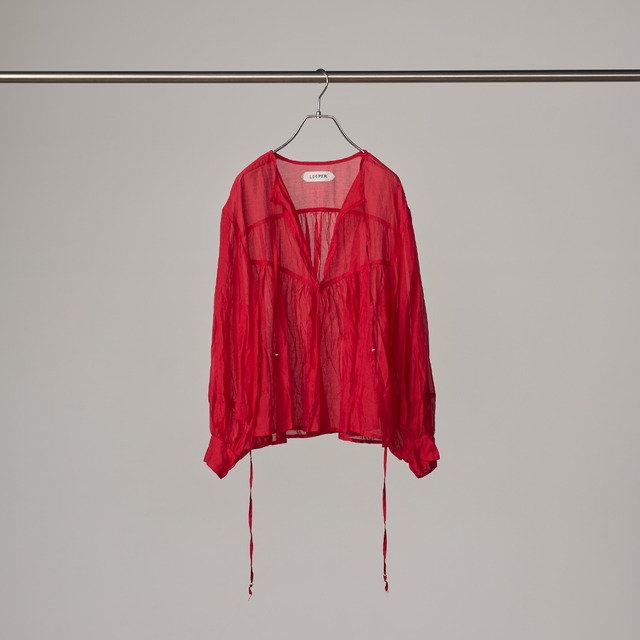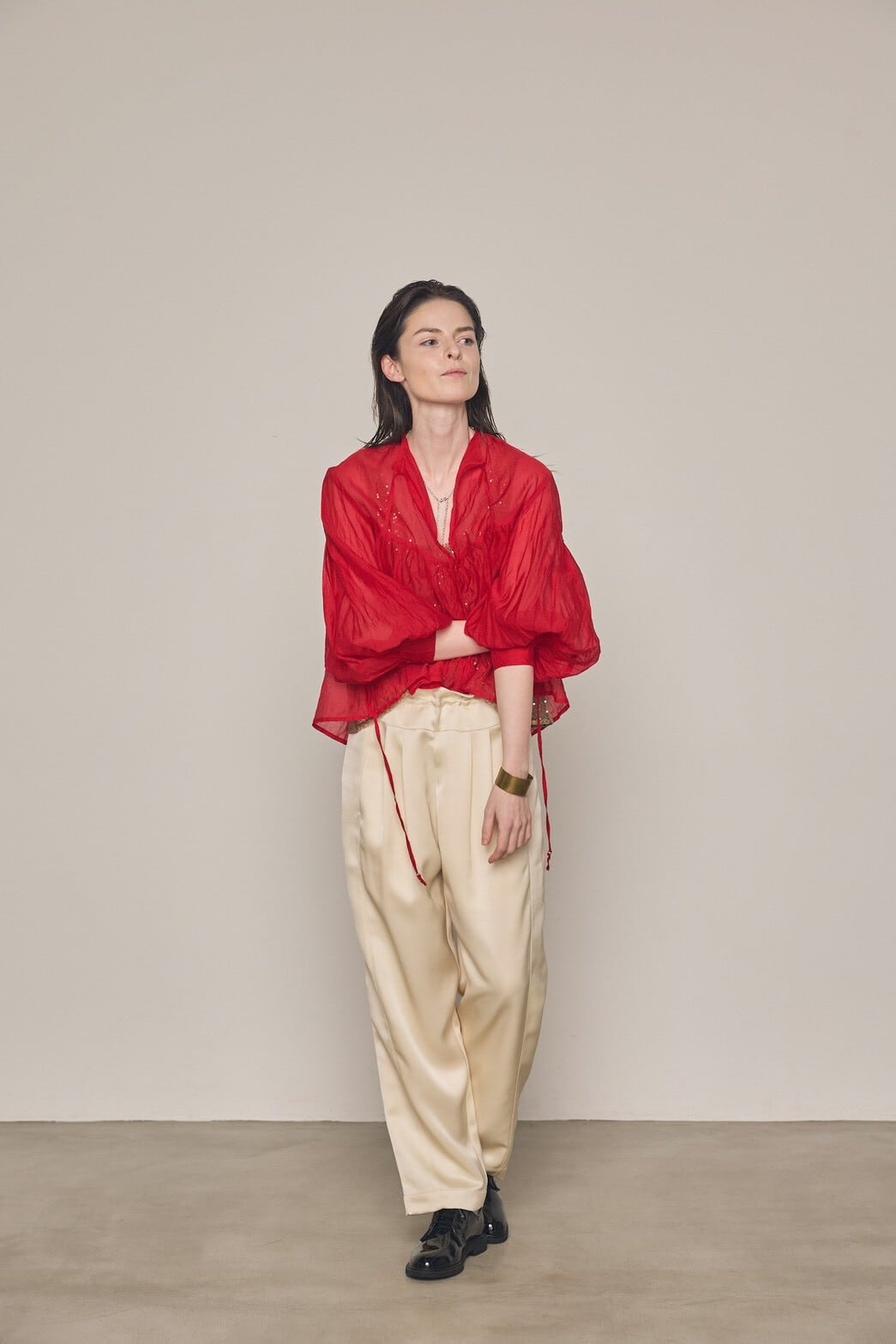 [material] (生地 1) cotton : 68% silk : 32% [size] 肩幅:48cm 着丈:58cm 袖丈:54cm バスト:79cm 1stコレクションのラミーブラウスをベースに、上質なシルクコットン素材で再構築したトップスです。 着丈をヒップ上の軽やかな長さに設定し、袖口には円形のパターン操作を加えることで、よりドラマチックなボリューム感をプラスしました。肩幅をあえて華奢に設定してトップのボリュームを抑え、裾に向かって美しく広がるフレアシルエットを際立たせています。