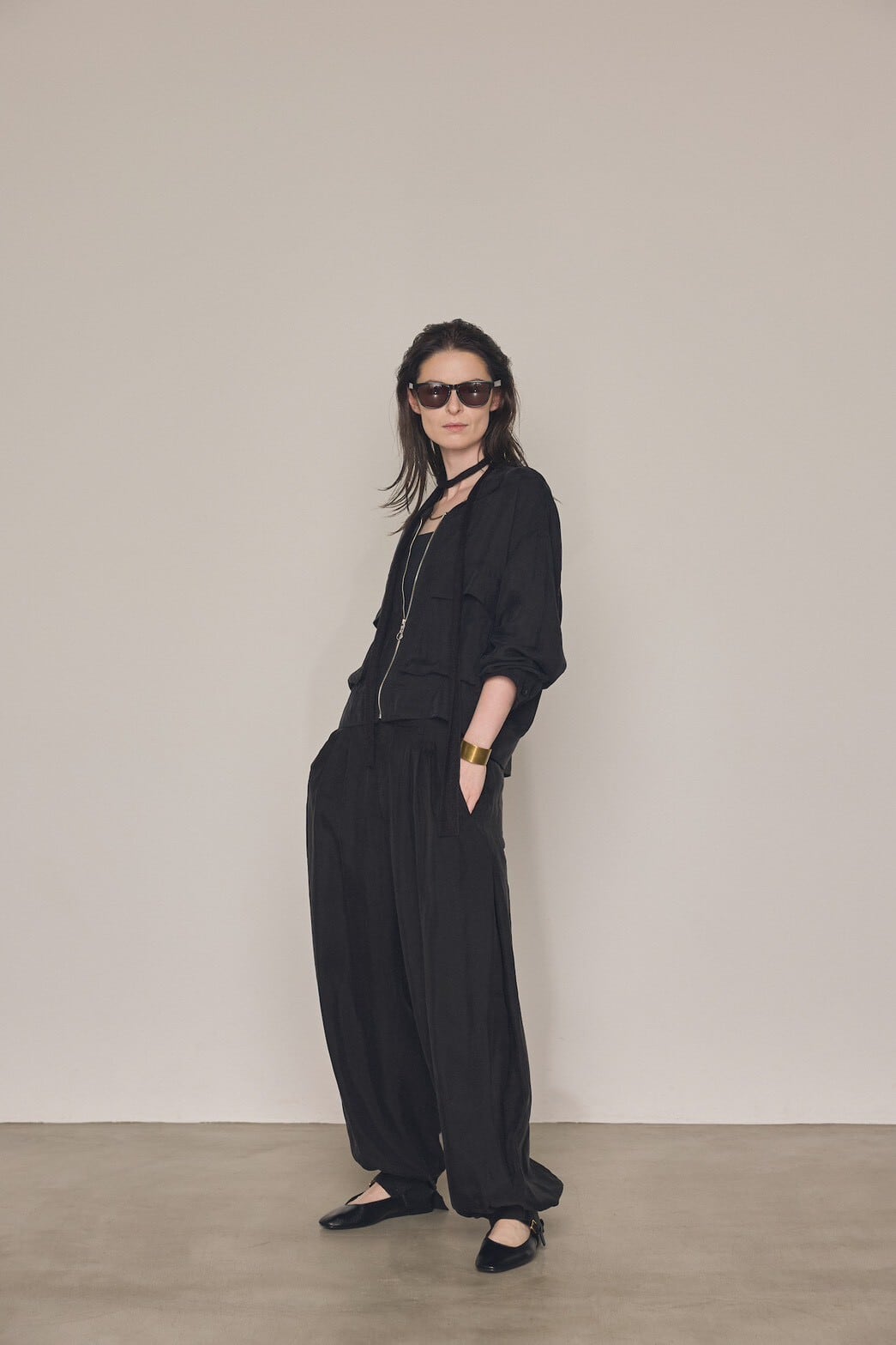 [material] cupro : 64% modal : 36% [size] 総丈:104cm ウエスト:94cm〜 股下:69,3cm トップス(2602TP101)と同素材のピーチスキンを使用した、共布ベルト付きのハイウエストパラシュートパンツです。 最大の特徴はウエストの可変デザイン。ボタンを外してウエスト部分を外側に折り返すことで、インナーを見せたりシルエットに変化をつけたりと、自由なスタイリングを楽しめます。ヴィンテージライクな素材感と、遊び心のあるディテールが融合した一本です。
