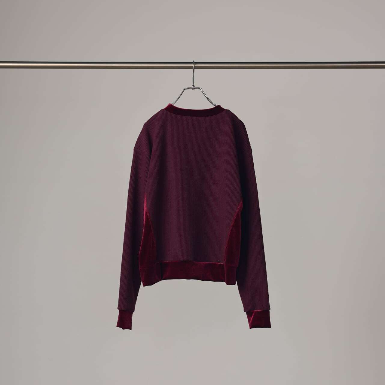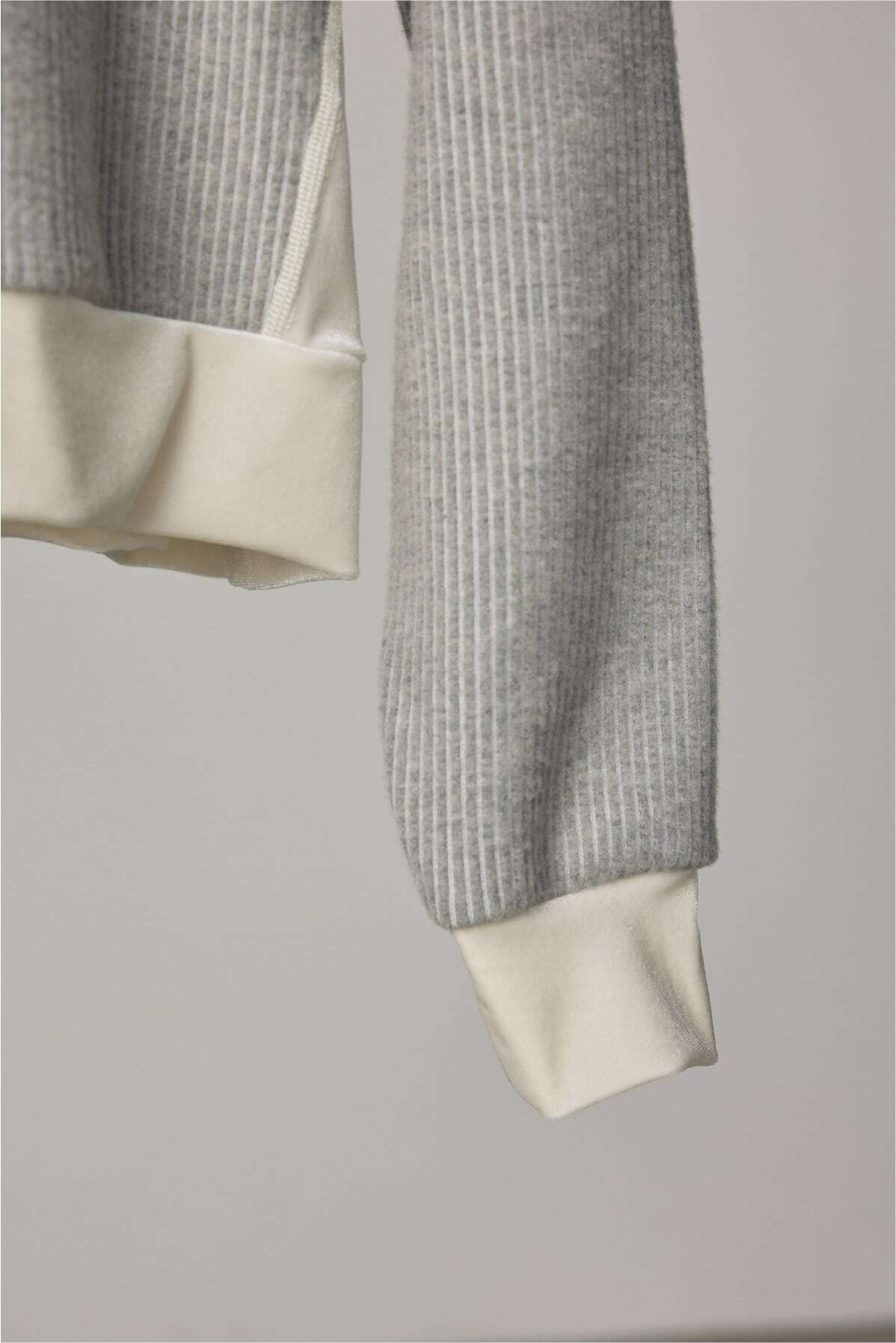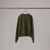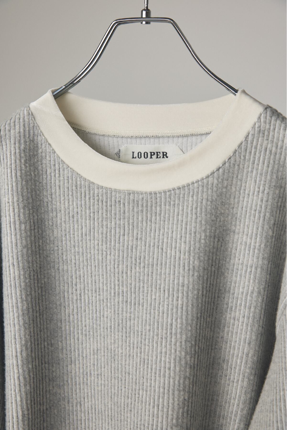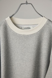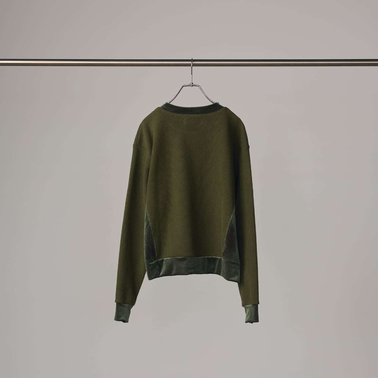 リブのような畝(うね)を持つソフトなタッチのニットコールと、挑発的かつエレガントな光沢を持つベロアを掛け合わせたトップスです。 脇部分の縫製には、水着や下着にも使われる特殊ミシン「フラットシーマ」を採用。素材同士の厚みを抑えて平らに仕上げることで、素肌のあたり方が優しい着心地を実現しました。