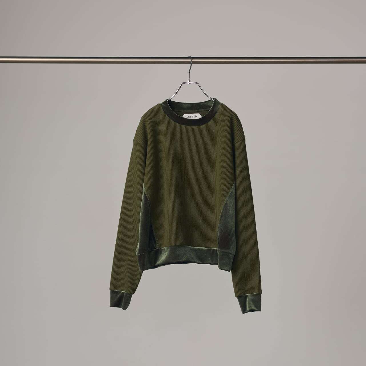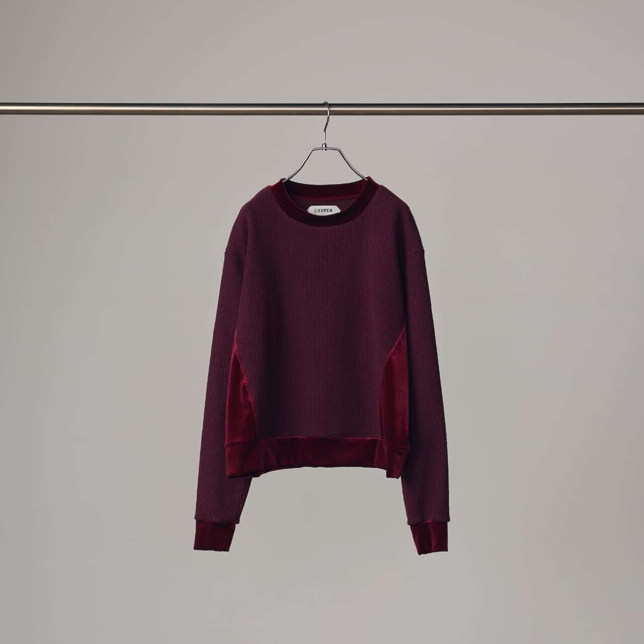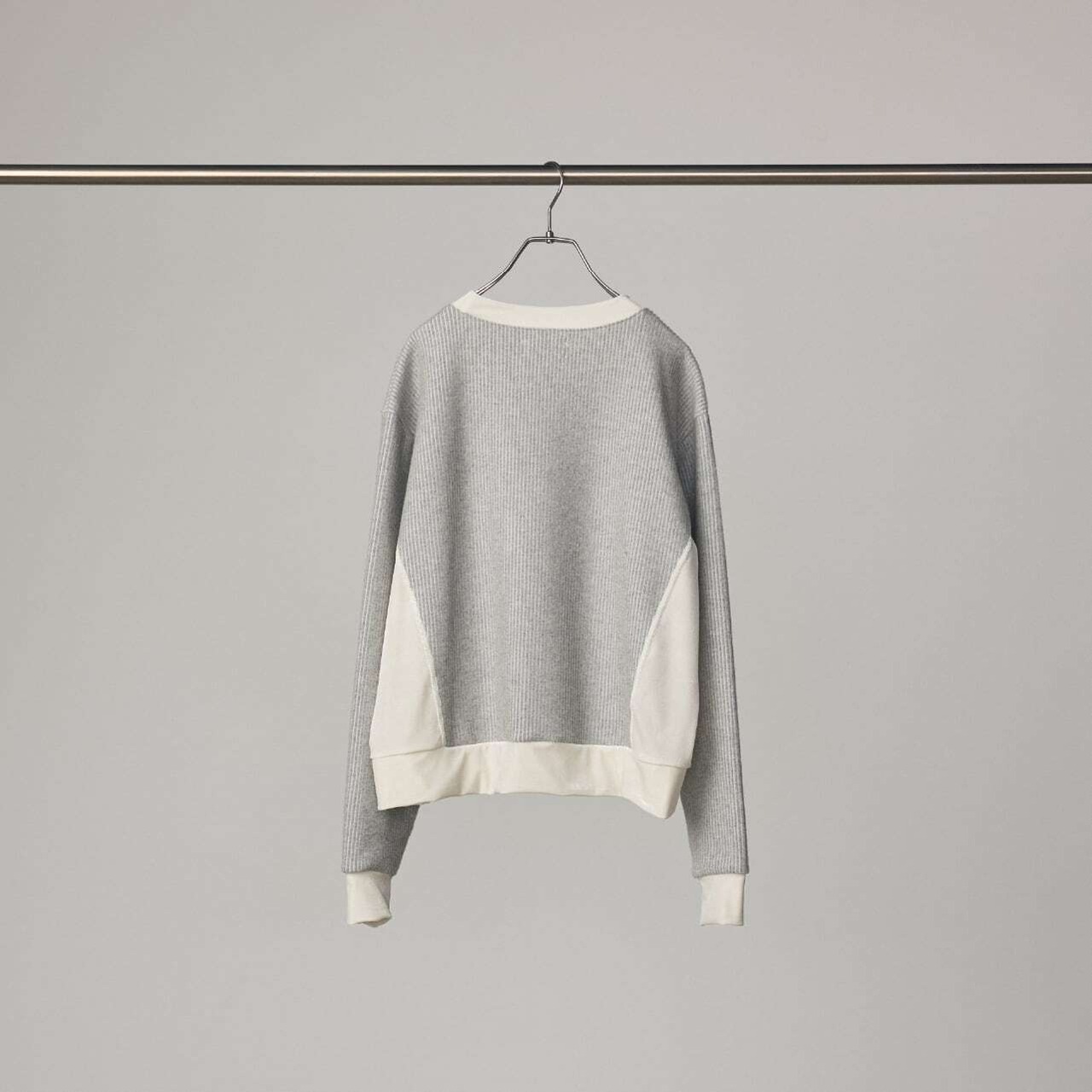 リブのような畝(うね)を持つソフトなタッチのニットコールと、挑発的かつエレガントな光沢を持つベロアを掛け合わせたトップスです。 脇部分の縫製には、水着や下着にも使われる特殊ミシン「フラットシーマ」を採用。素材同士の厚みを抑えて平らに仕上げることで、素肌のあたり方が優しい着心地を実現しました。