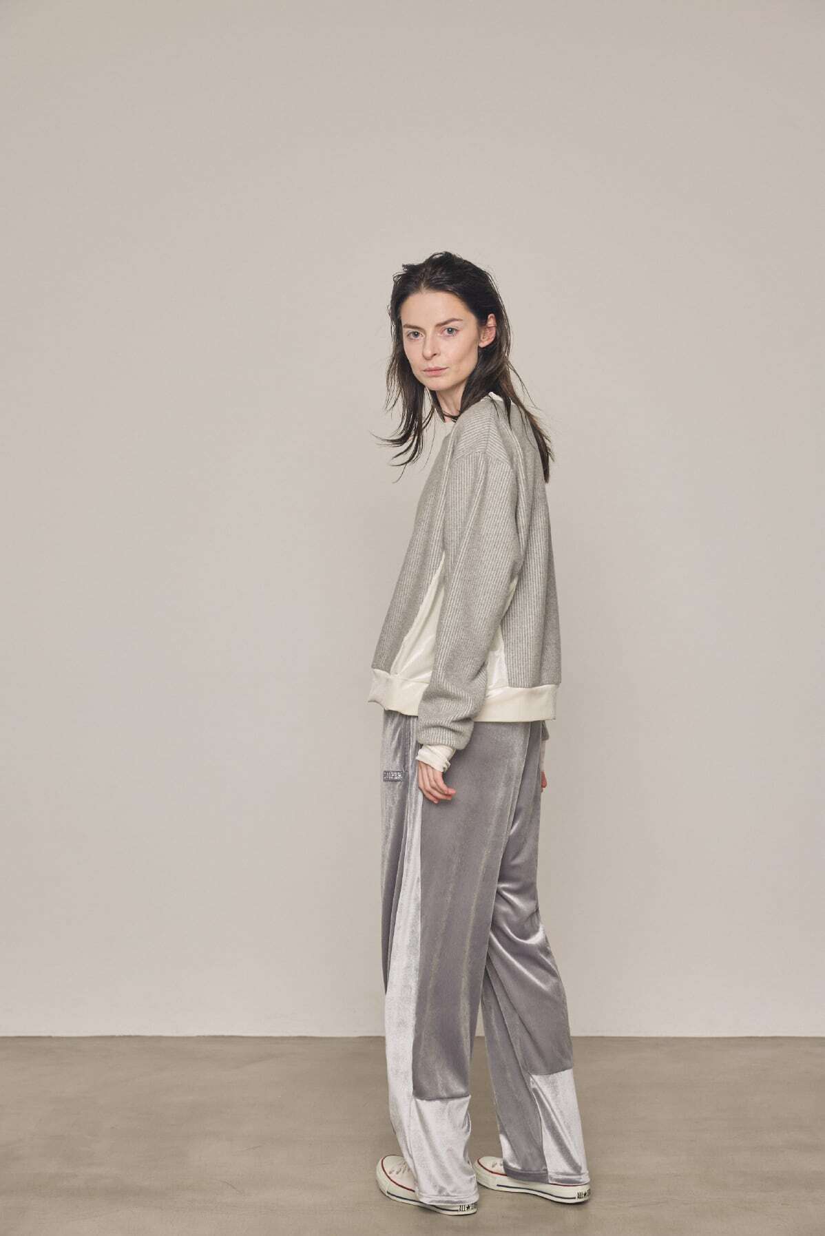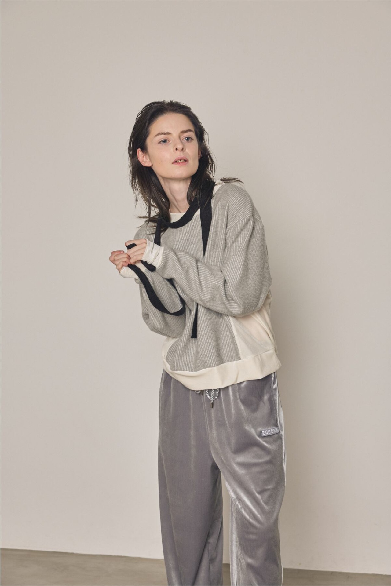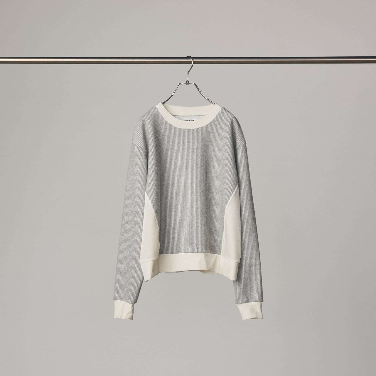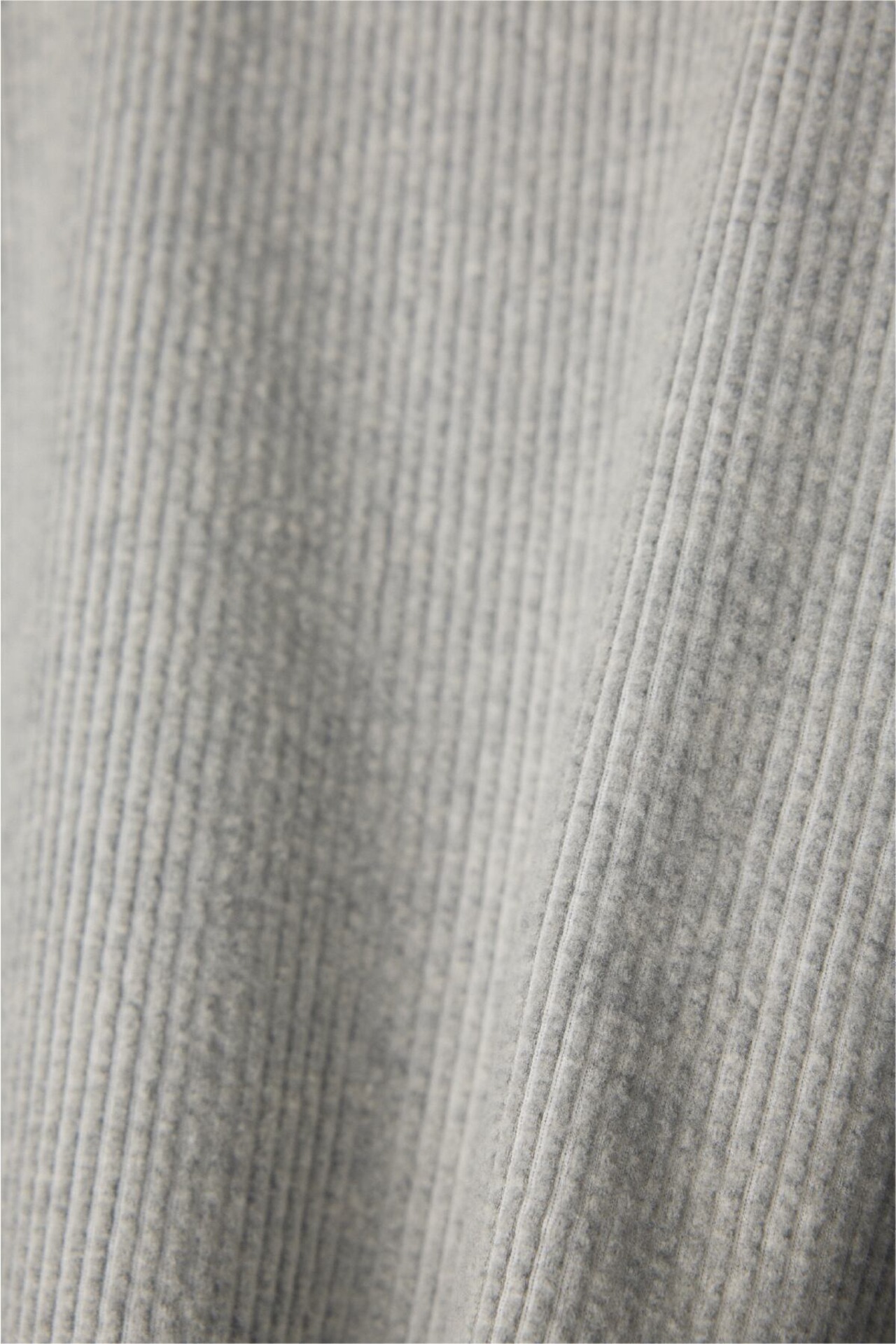 リブのような畝(うね)を持つソフトなタッチのニットコールと、挑発的かつエレガントな光沢を持つベロアを掛け合わせたトップスです。 脇部分の縫製には、水着や下着にも使われる特殊ミシン「フラットシーマ」を採用。素材同士の厚みを抑えて平らに仕上げることで、素肌のあたり方が優しい着心地を実現しました。