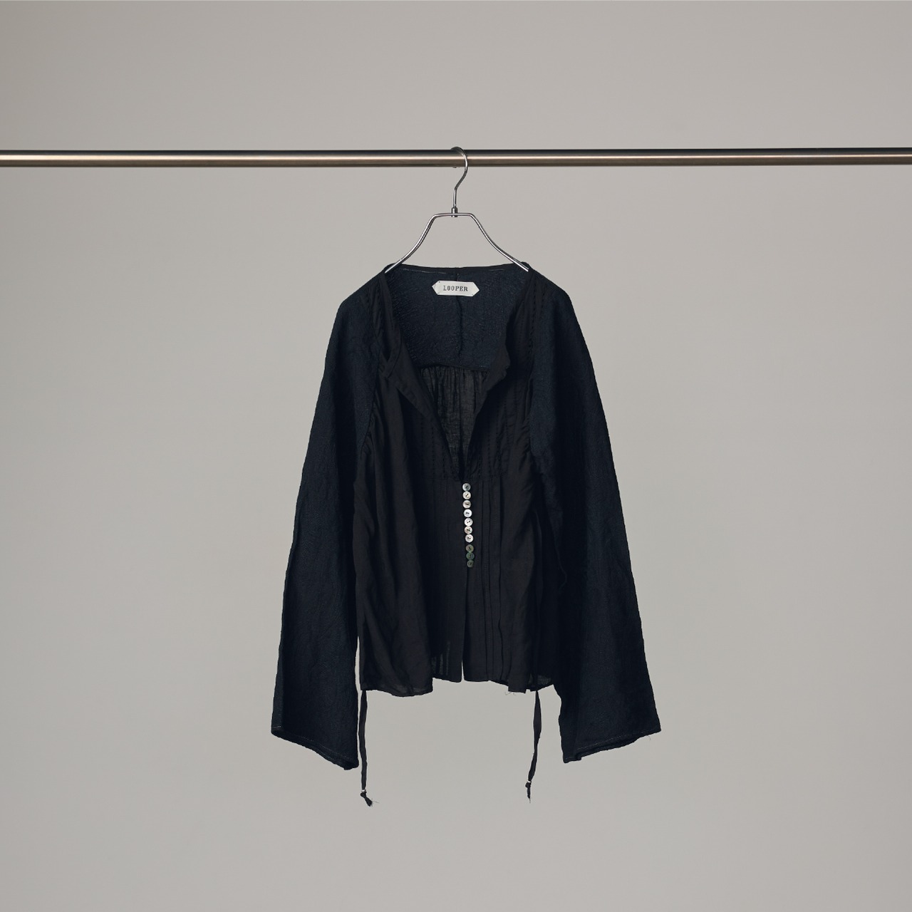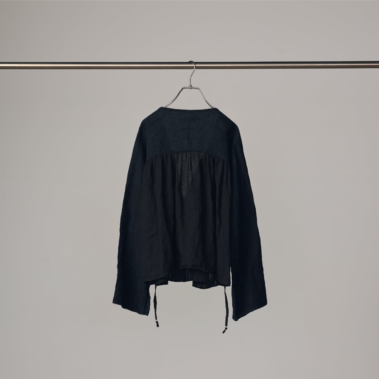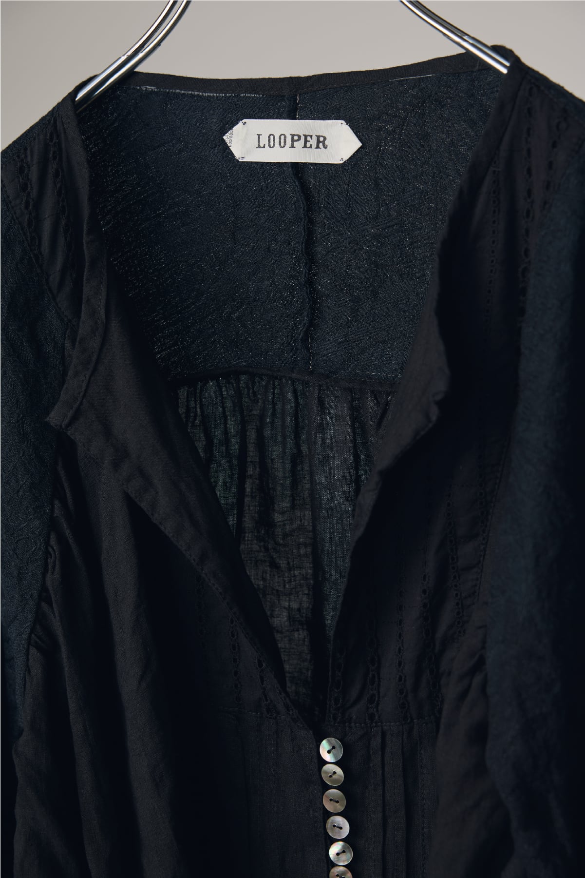 フレンチリネンをベースに、日本のリネンジャガード生地とカットレースを組み合わせた、多国籍な素材感が融合するヴィンテージライクなブラウスです。 シェルボタンの横には2本のプリーツを配し、さらに共布のテープを叩きつけることで、平面的になりがちなレースアイテムに奥行きと立体感を与えています。異なる文化の素材が織りなす、独特のコントラストをお楽しみください
