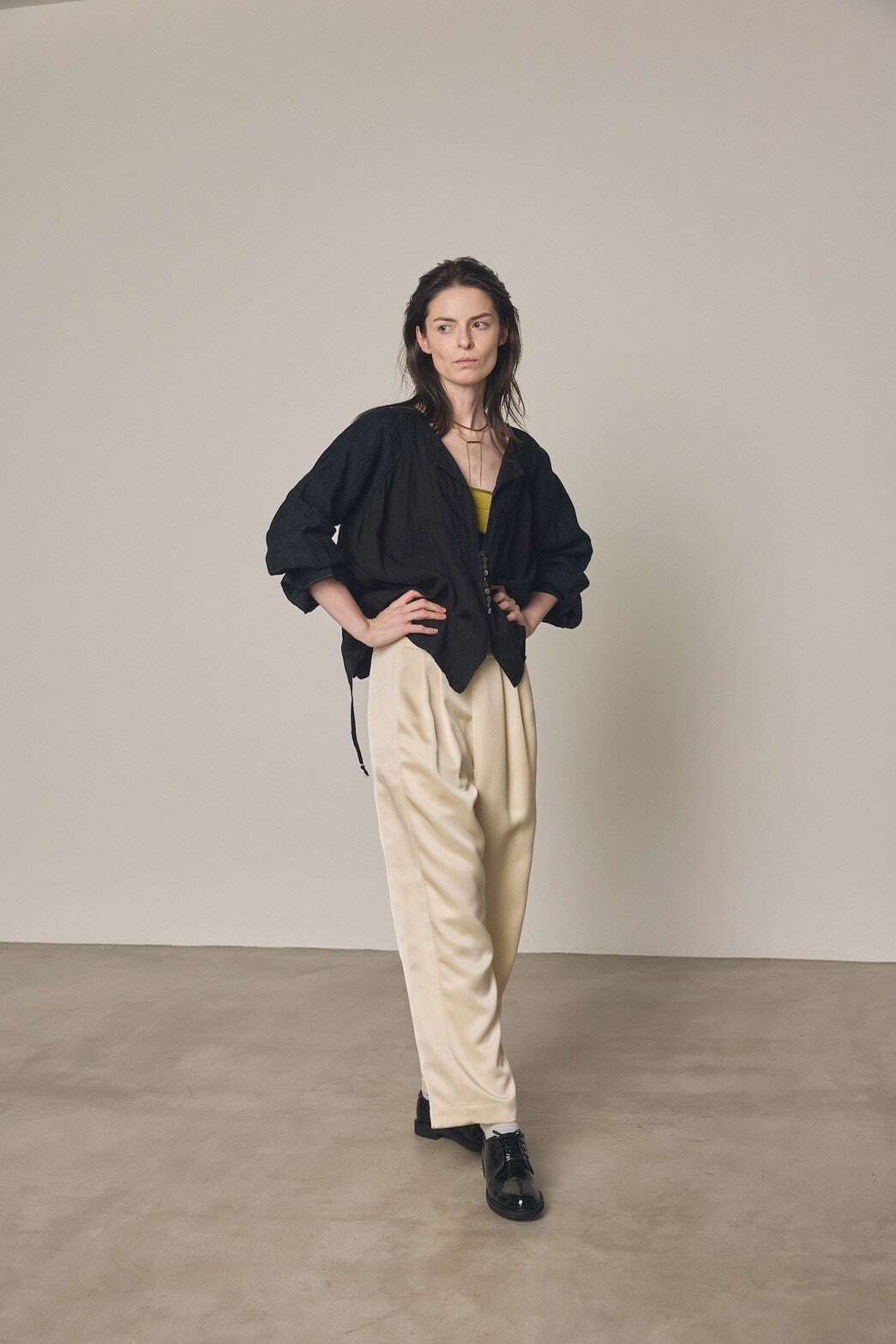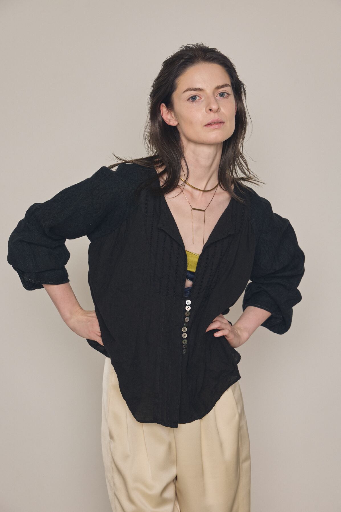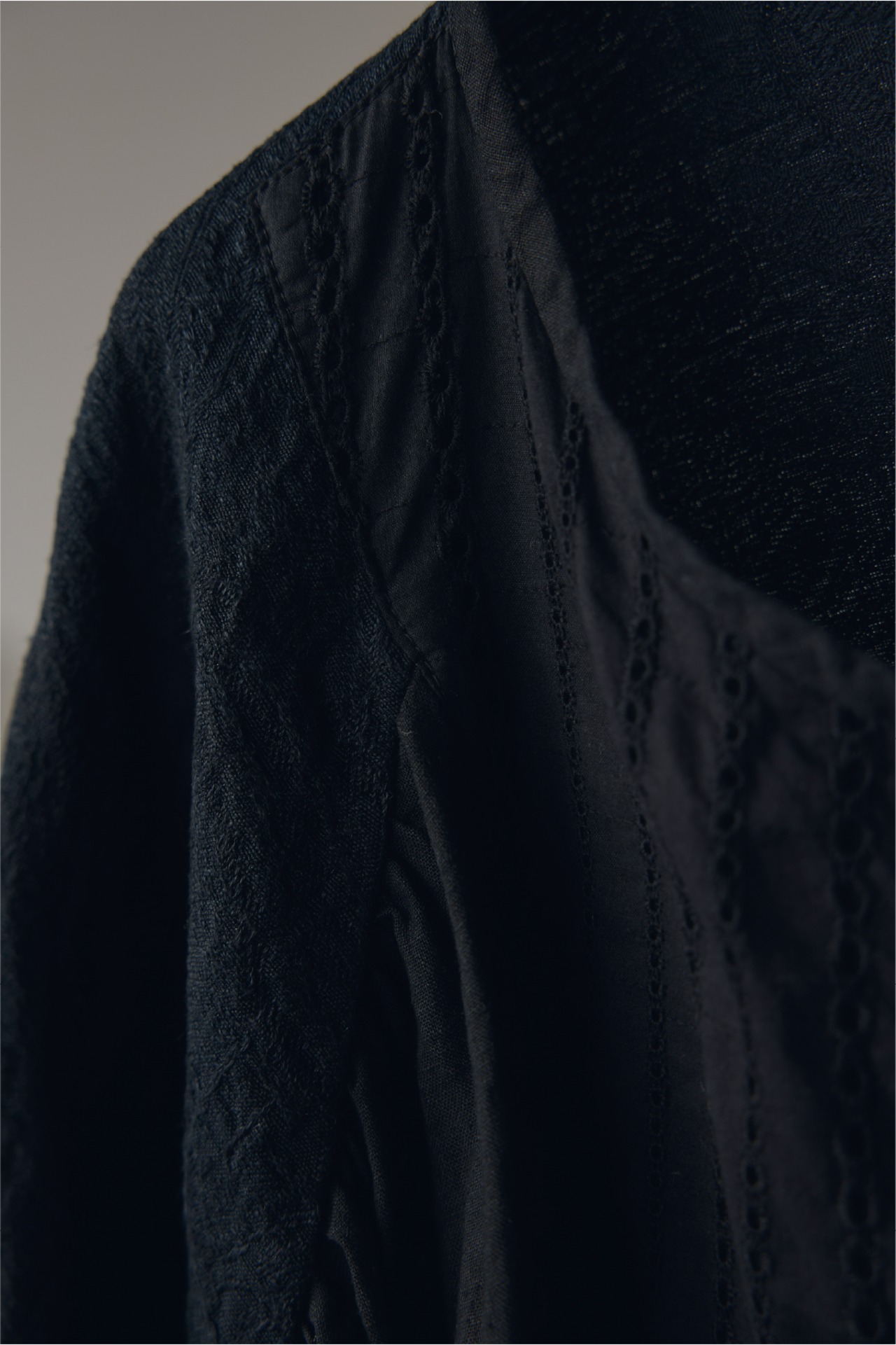 フレンチリネンをベースに、日本のリネンジャガード生地とカットレースを組み合わせた、多国籍な素材感が融合するヴィンテージライクなブラウスです。 シェルボタンの横には2本のプリーツを配し、さらに共布のテープを叩きつけることで、平面的になりがちなレースアイテムに奥行きと立体感を与えています。異なる文化の素材が織りなす、独特のコントラストをお楽しみください