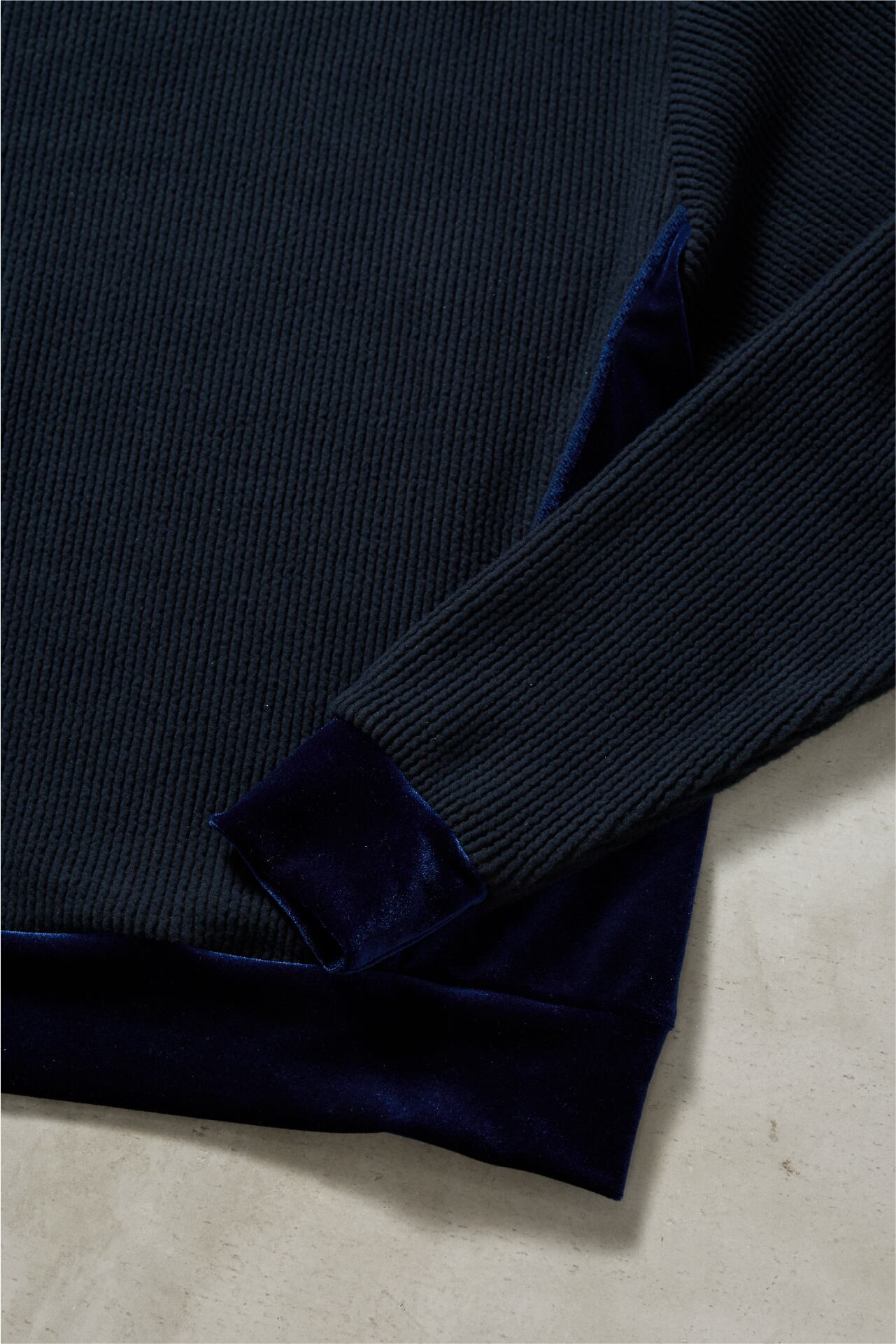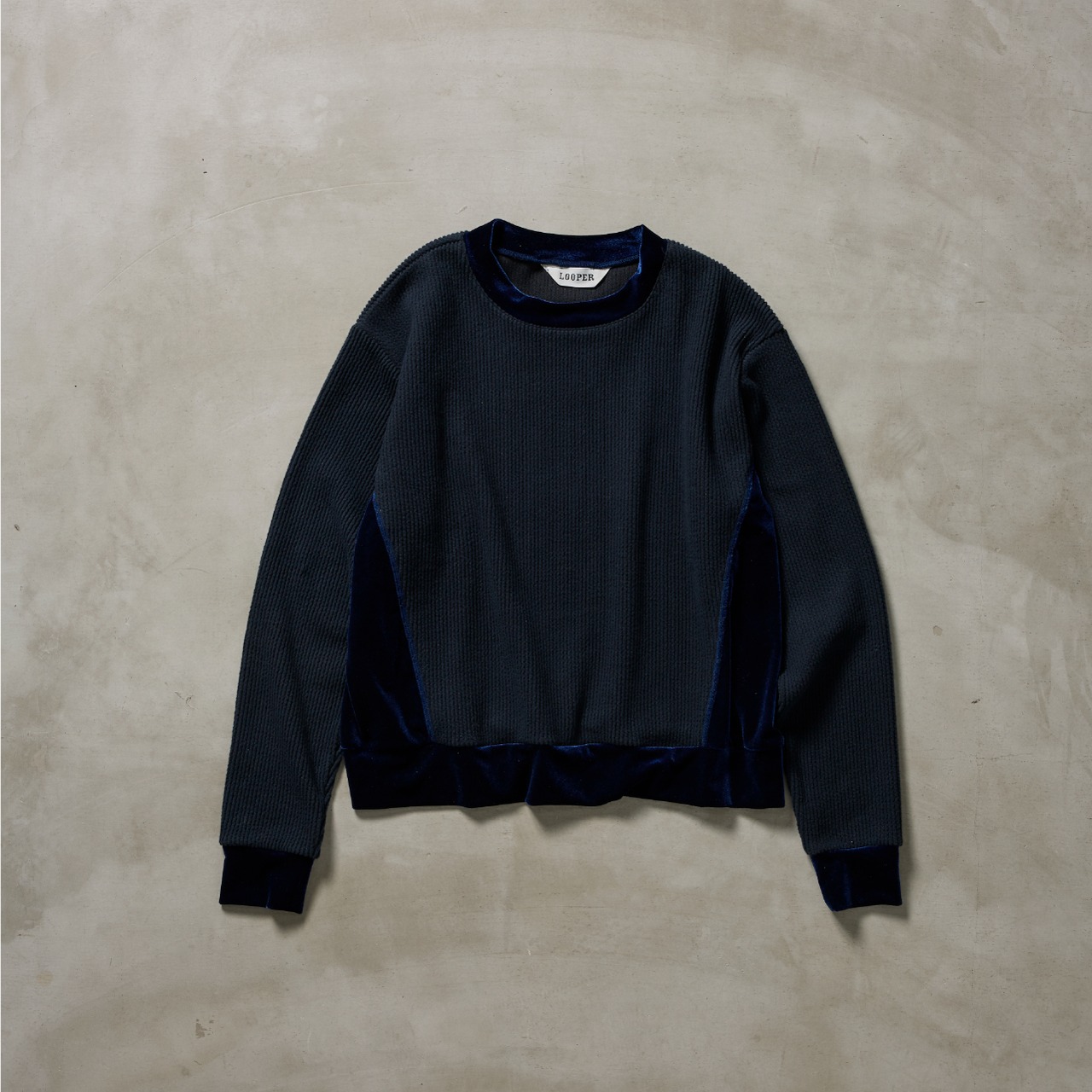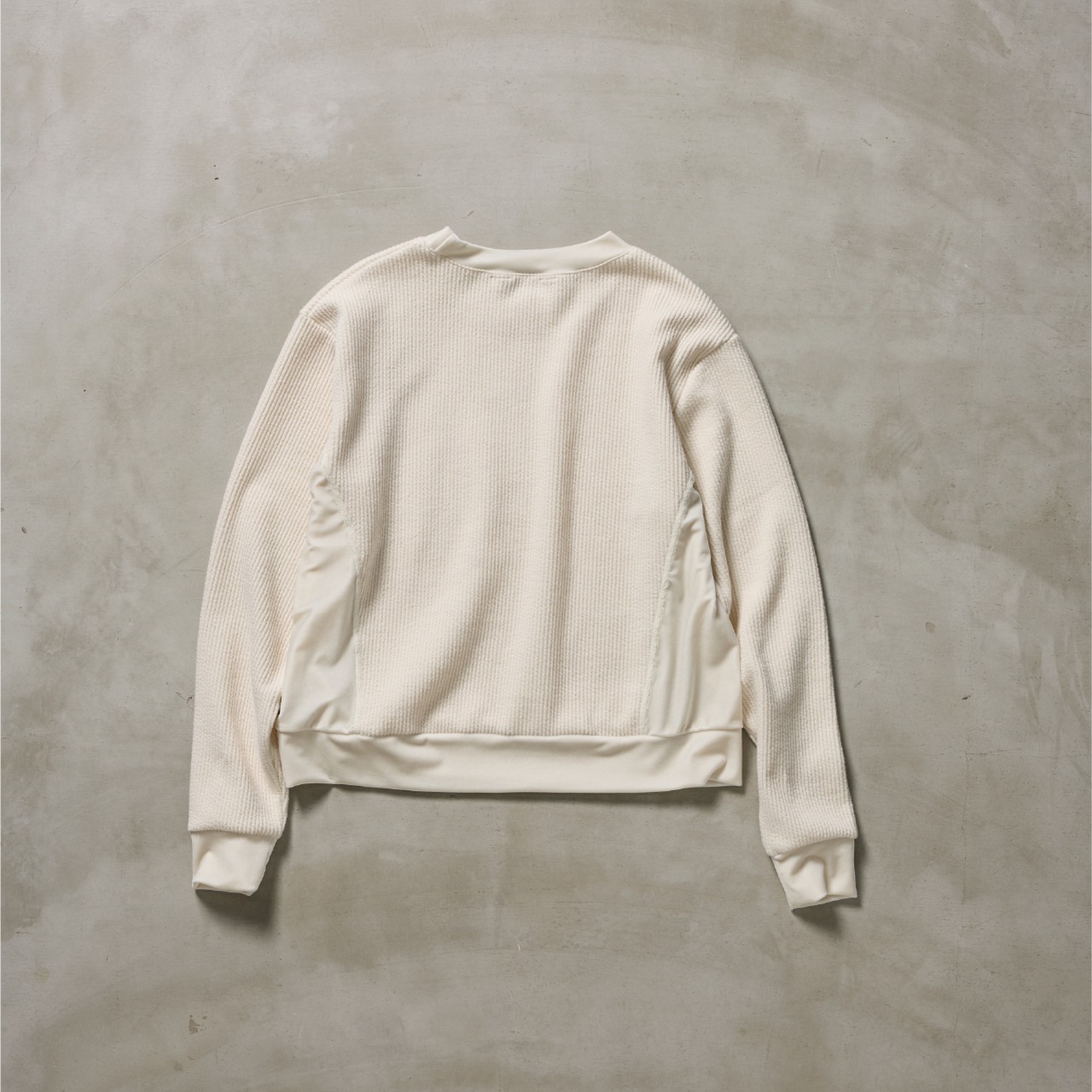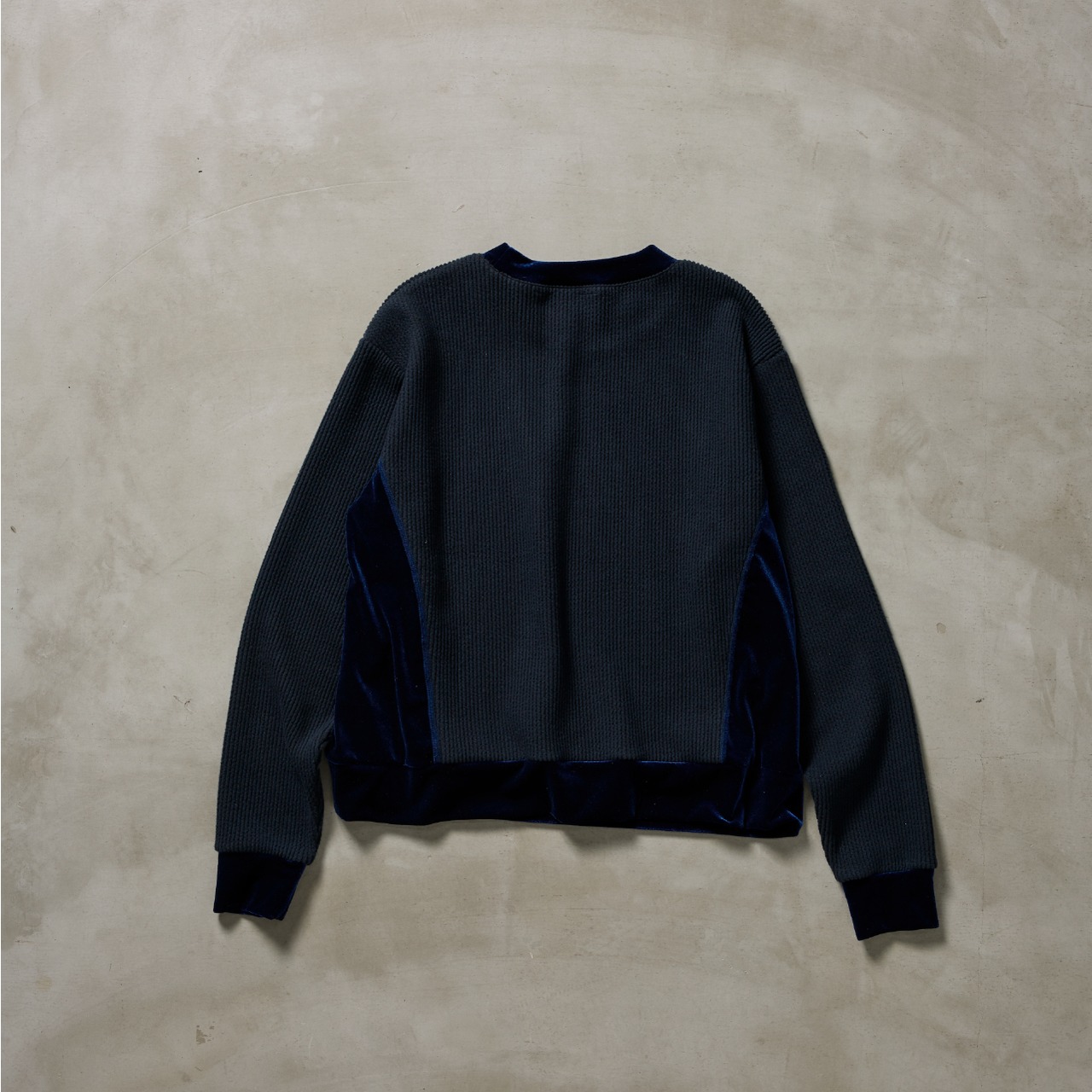 ニットのリブ編みのようなクッション性のある表面と、肌あたりのやさしいフラットな裏面を併せ持つ素材に、ベロアを組み合わせた異素材トップス。
