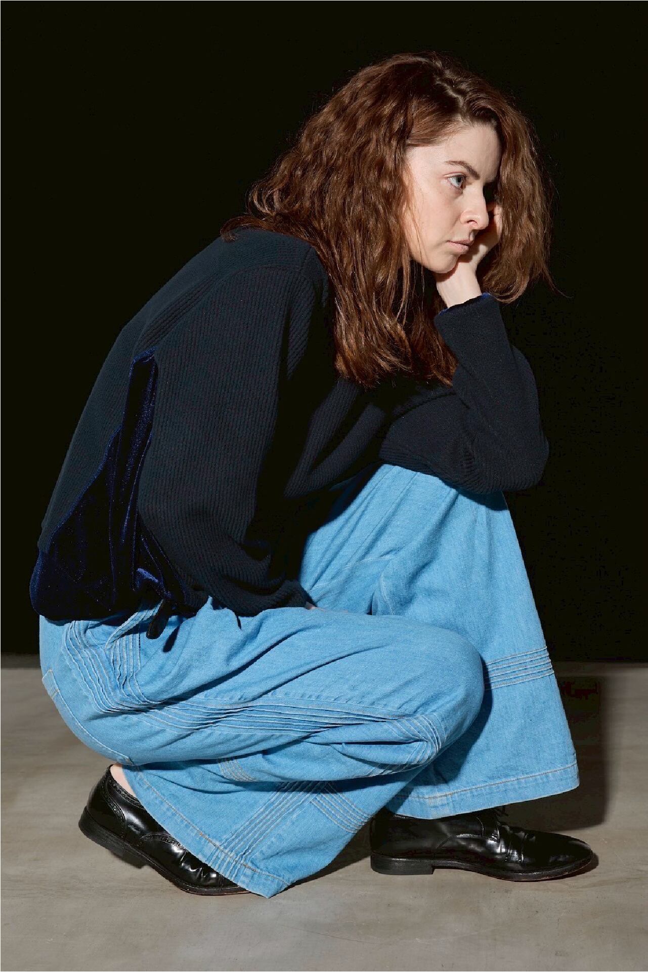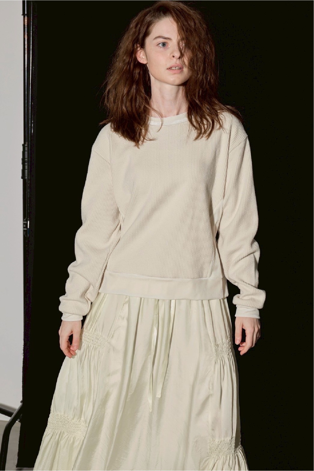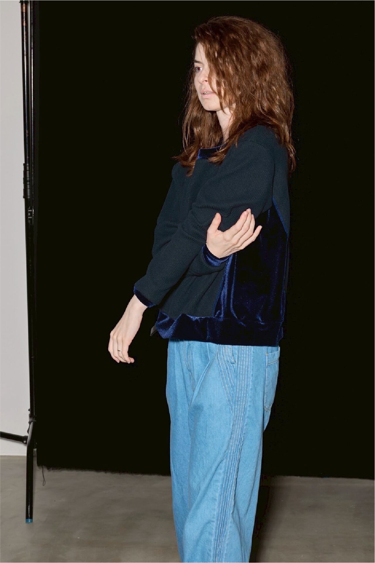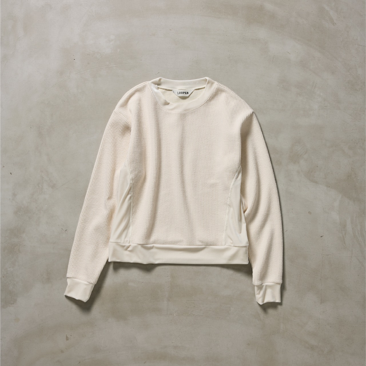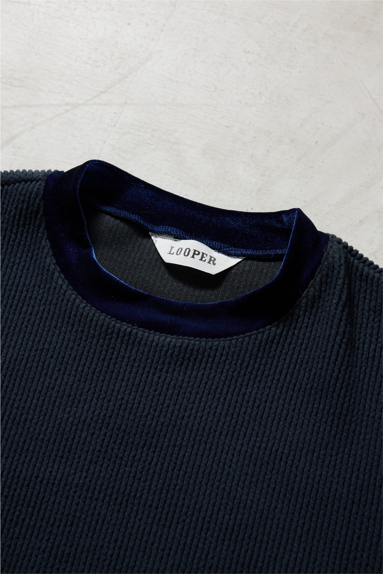 ニットのリブ編みのようなクッション性のある表面と、肌あたりのやさしいフラットな裏面を併せ持つ素材に、ベロアを組み合わせた異素材トップス。