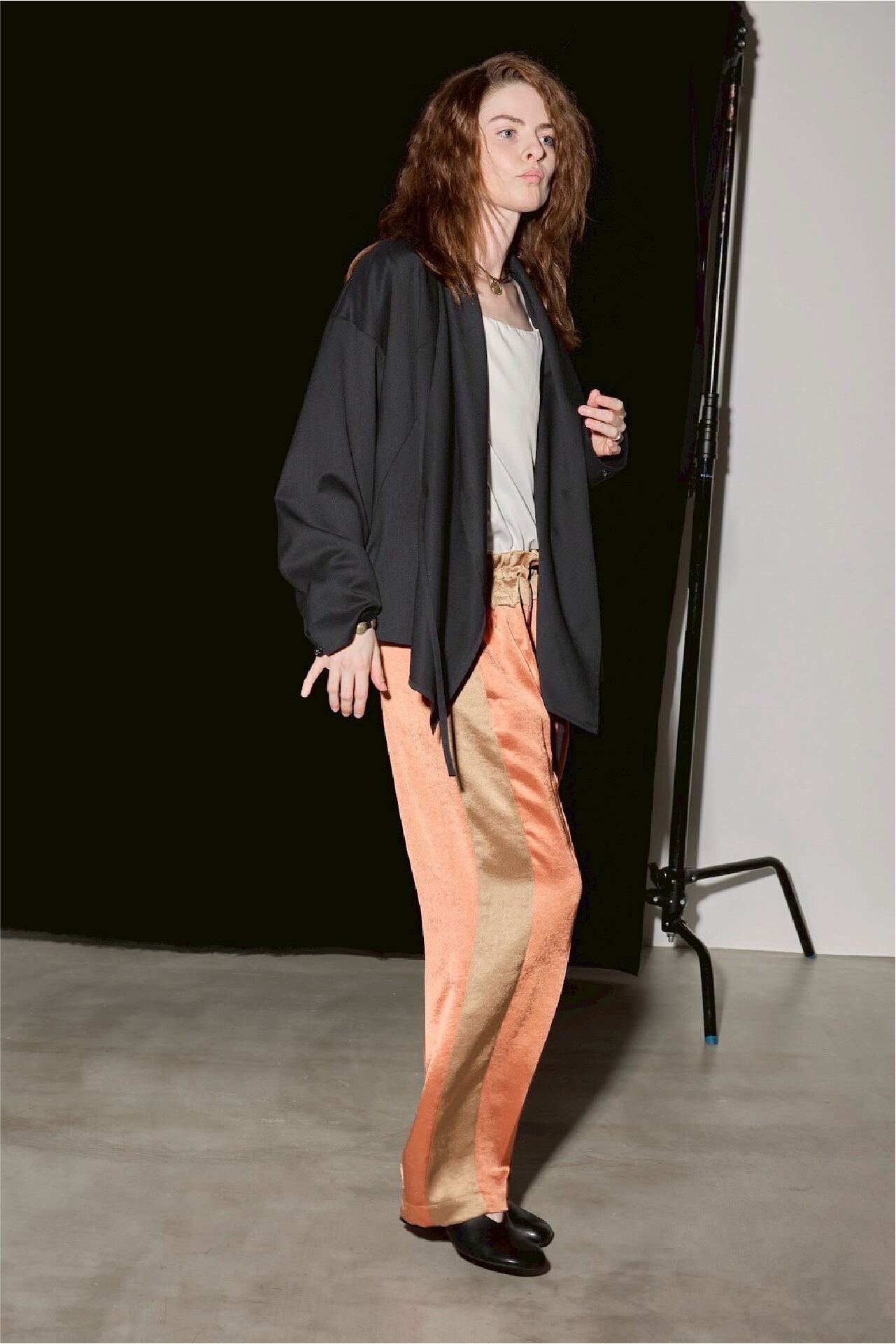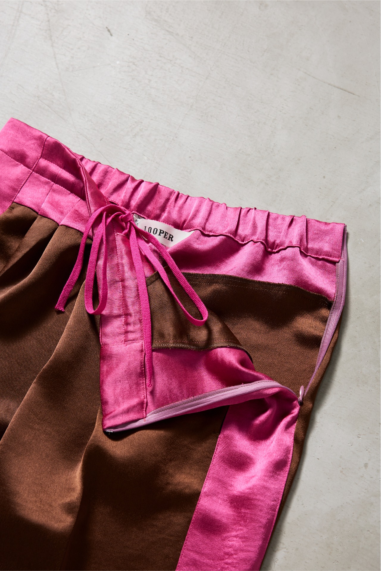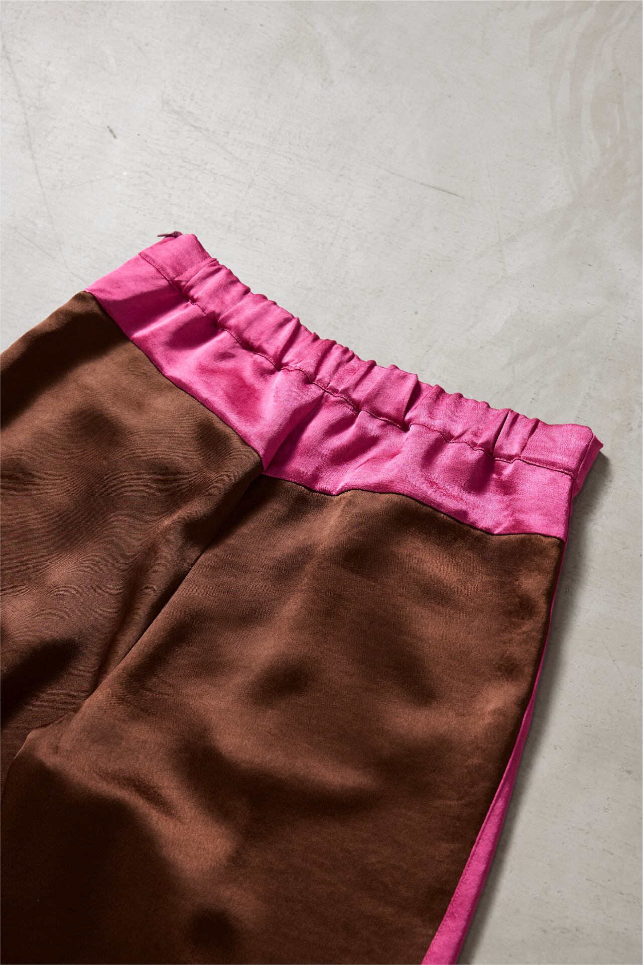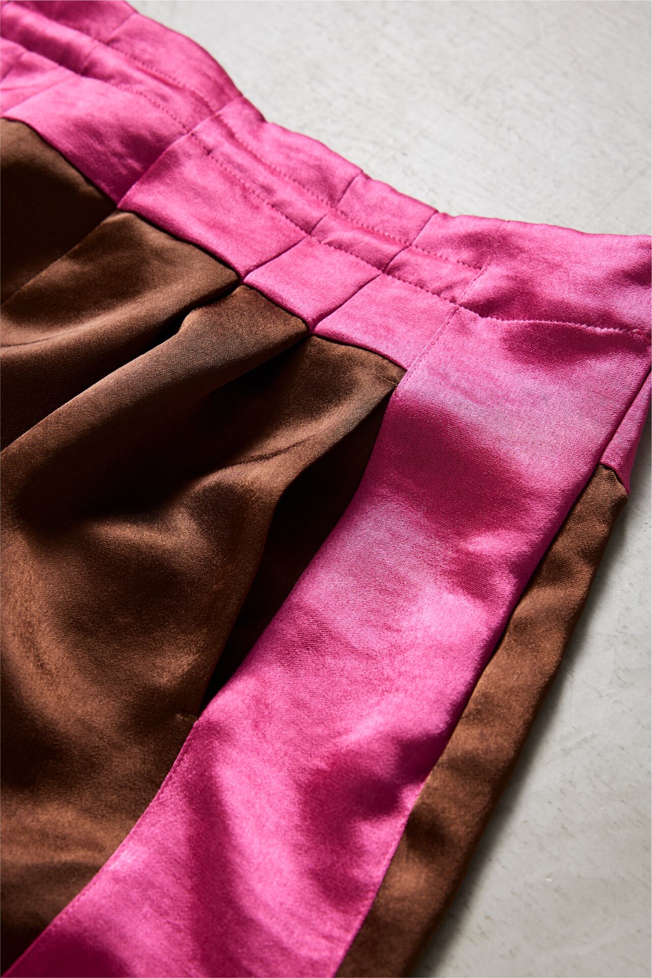 その生地を活かして仕立てた、バイカラーのライン入りドレスイージーパンツ。