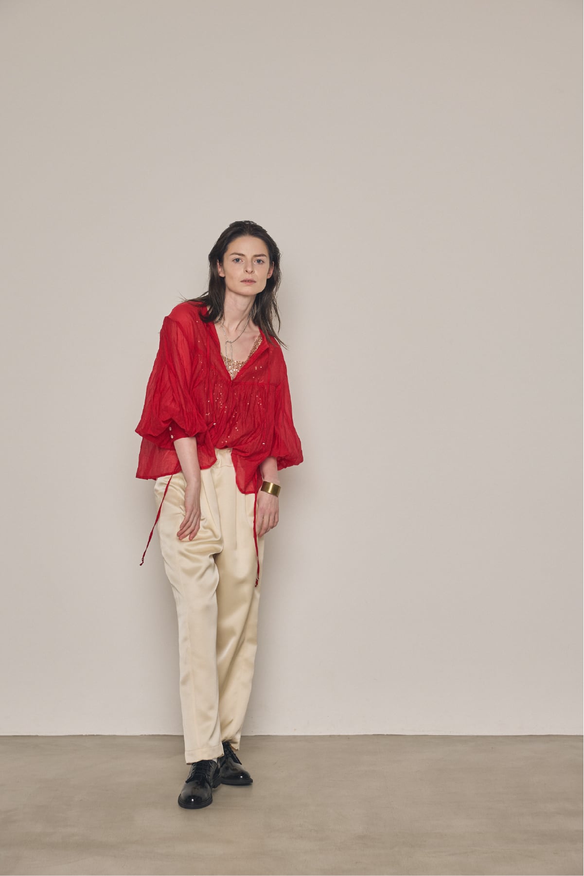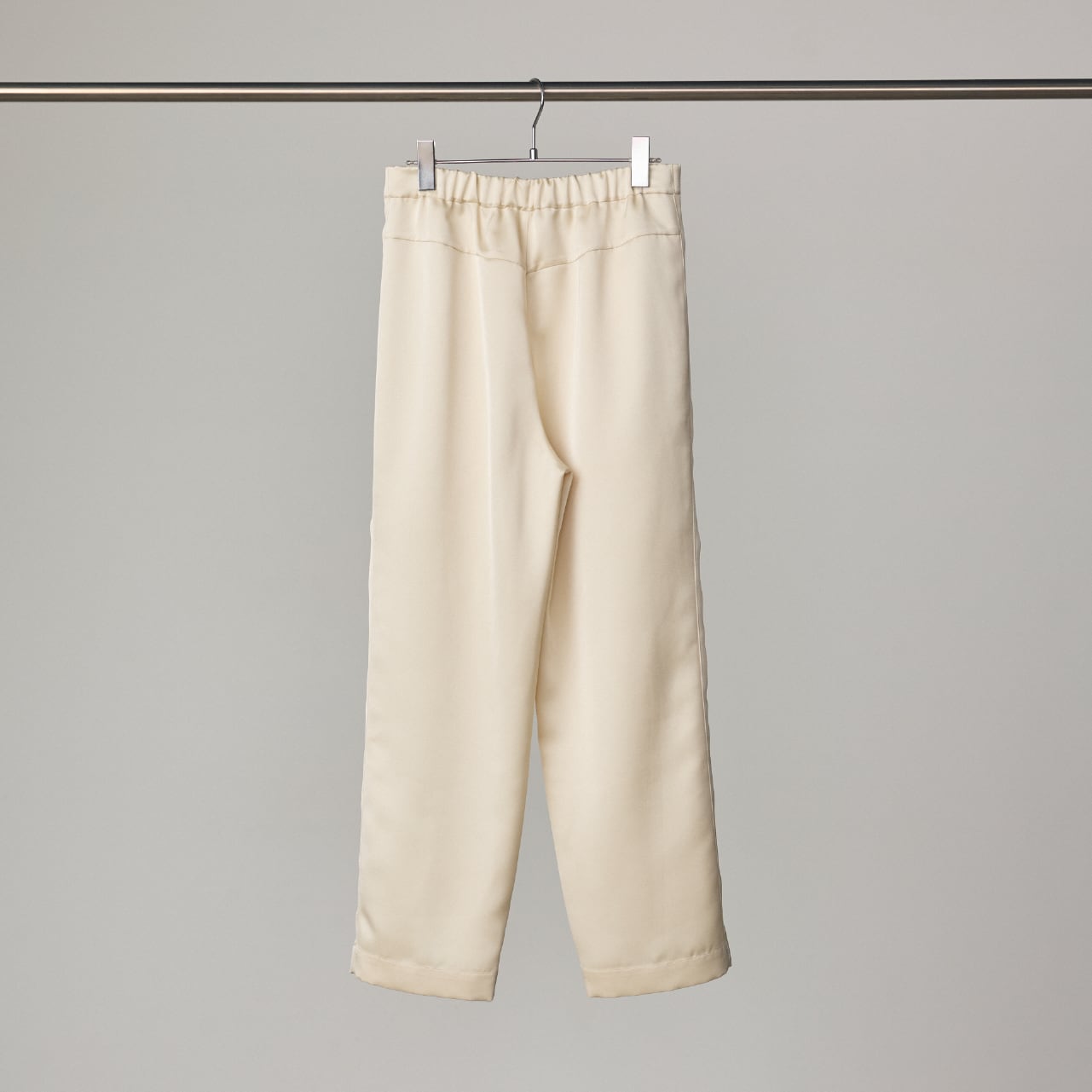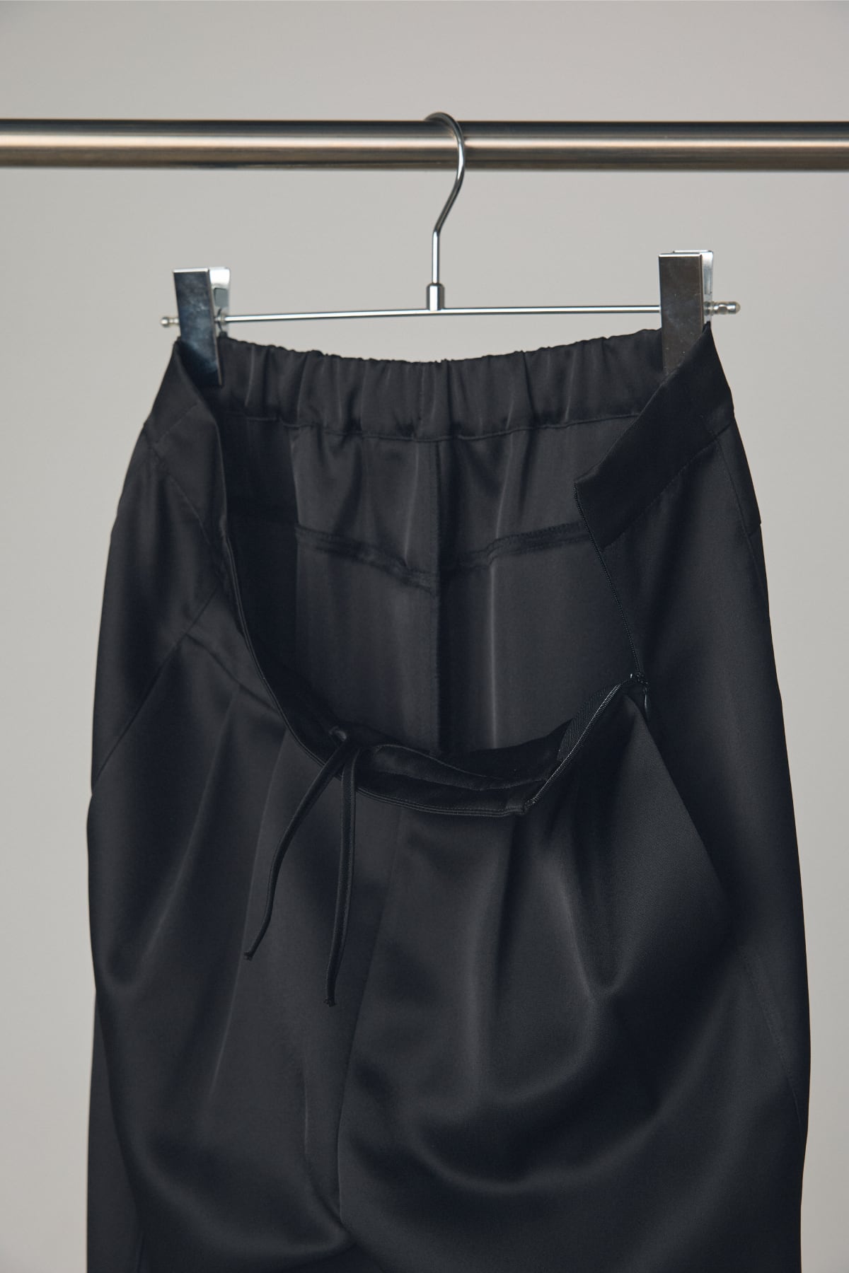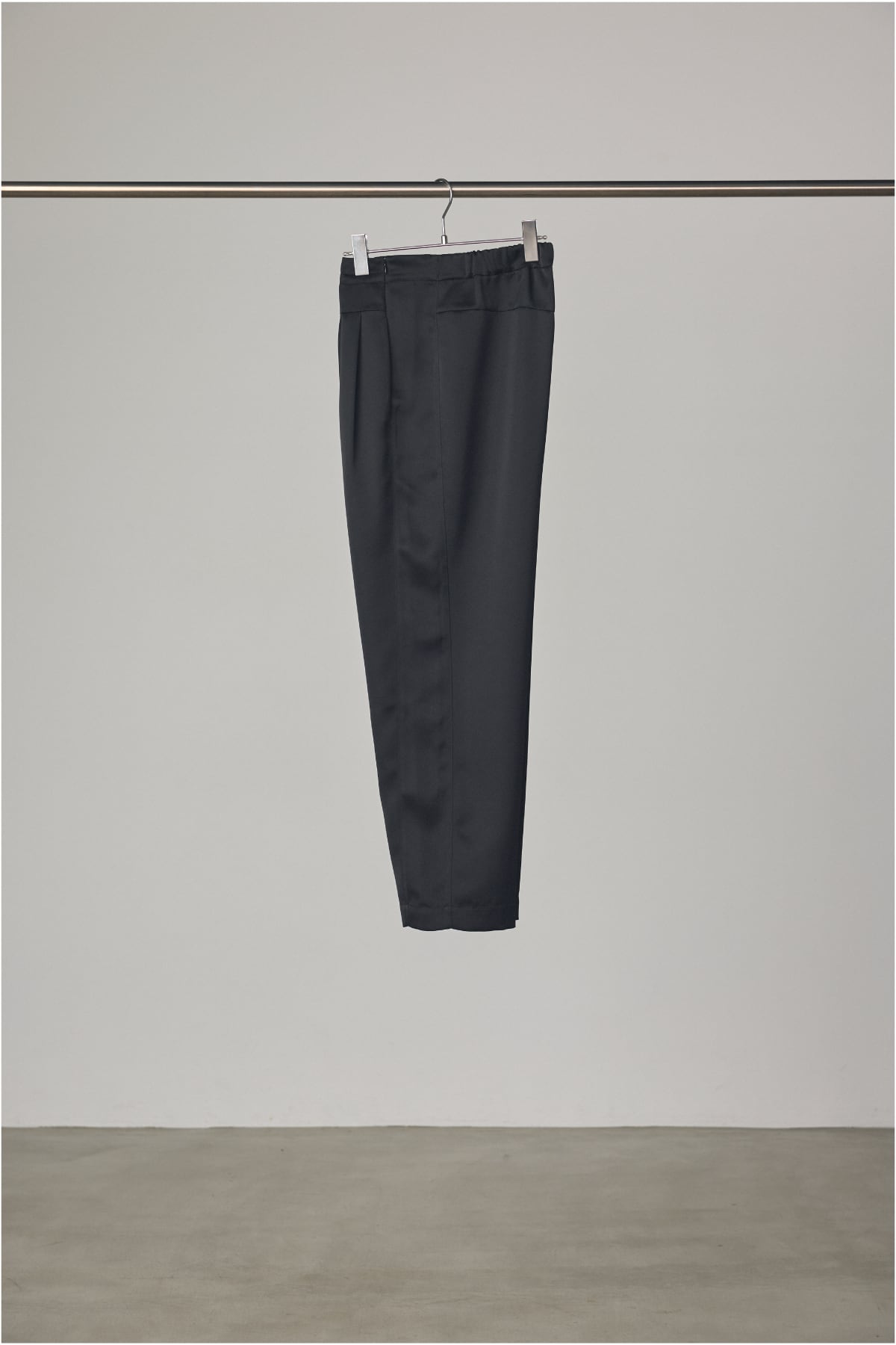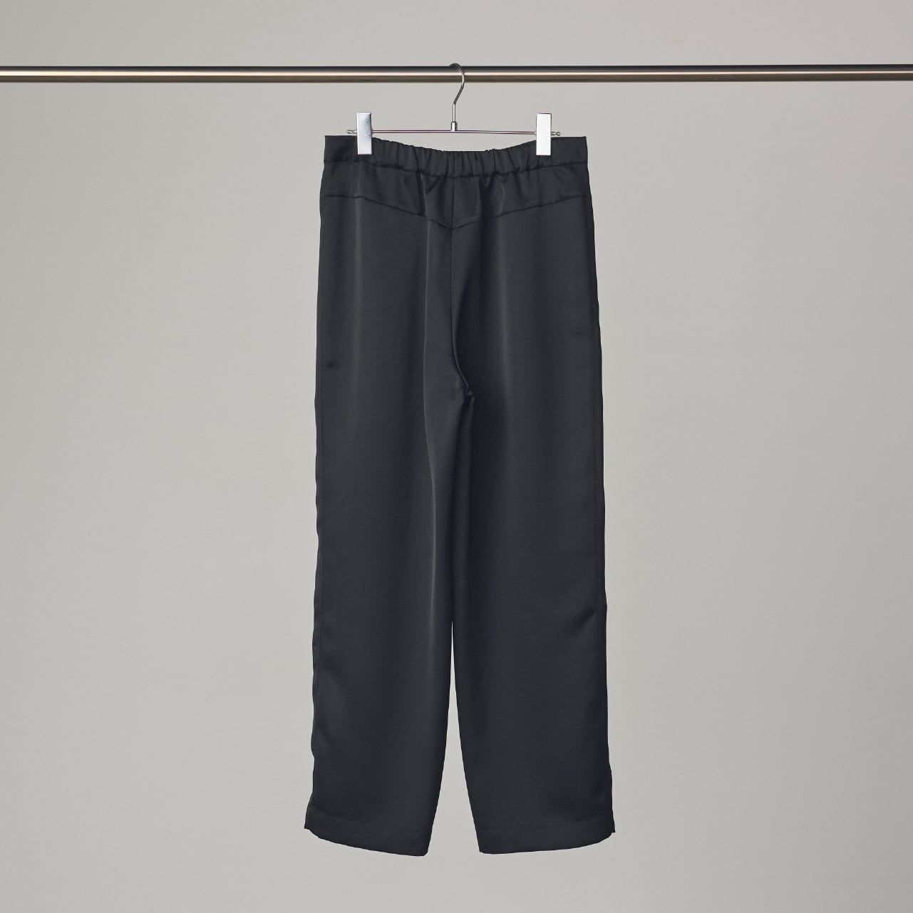 肉厚でとろみのあるダブルサテンを使用した、ストレートシルエットのイージーパンツです。 クラシックな2タック仕様に加え、サイドラインに切り替えを施すことで、シンプルながらも立体的で美しいシルエットに仕上げ、ディテールとラグジュアリーな素材感が融合した存在感のある一本です。